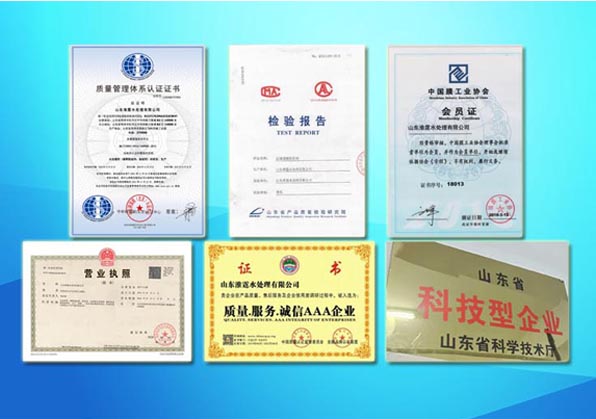 我们是水处理药剂生产厂家,拥有质量和环境管理体系、第三方检验报告、AAA企业证书、国家科技成果奖证书 等,同时我们还是山东省科技型企业、中国膜工业协会会员。等资质认证!