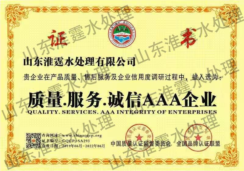 AAA企业证书 - 荣誉资质 - 反渗透膜阻垢剂_缓蚀阻垢剂_杀菌灭藻剂_粘泥剥离剂_山东PA旗舰厅水处理有限公司