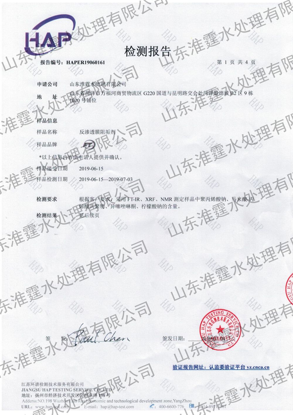 第三方检测报告(江苏环谱) - 荣誉资质 - 反渗透膜阻垢剂_缓蚀阻垢剂_杀菌灭藻剂_粘泥剥离剂_山东PA旗舰厅水处理有限公司