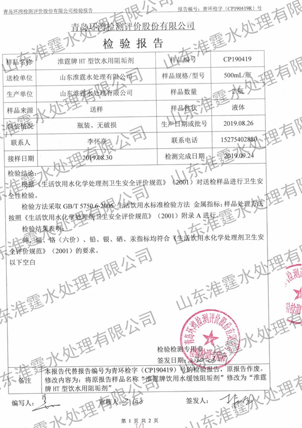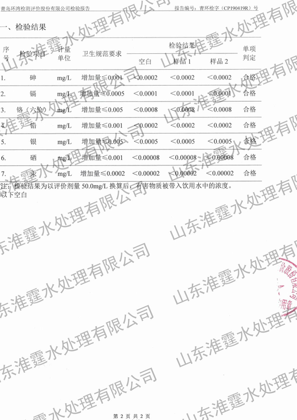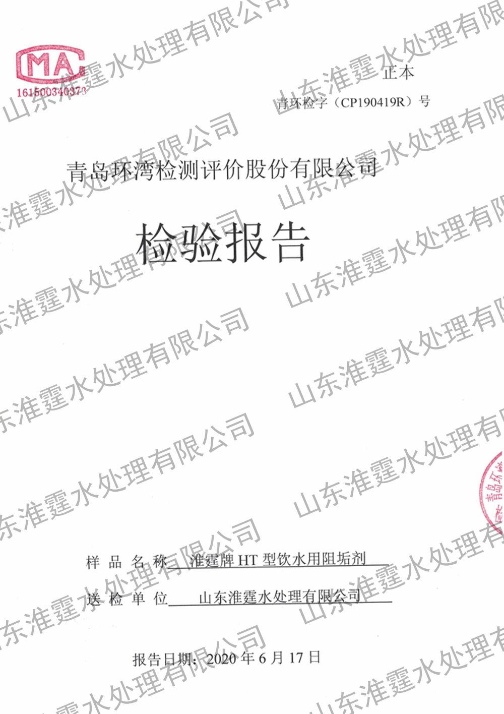 第三方检测报告(青岛环湾) - 荣誉资质 - 反渗透膜阻垢剂_缓蚀阻垢剂_杀菌灭藻剂_粘泥剥离剂_山东PA旗舰厅水处理有限公司
